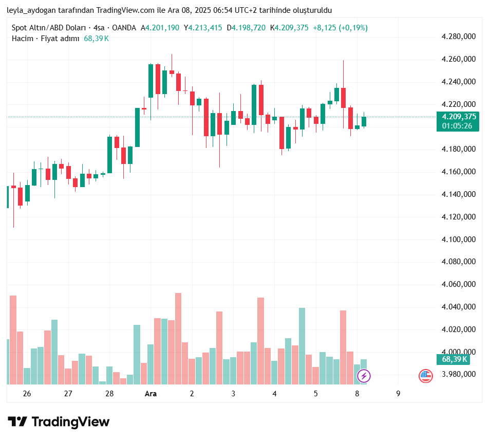 Spot altın yüzde 0,3 yükselişle ons başına 4.209,70 dolar seviyesine çıktı. ABD altın vadeli işlemleri ise 4.241,30 dolar civarında yatay bir seyir izledi.