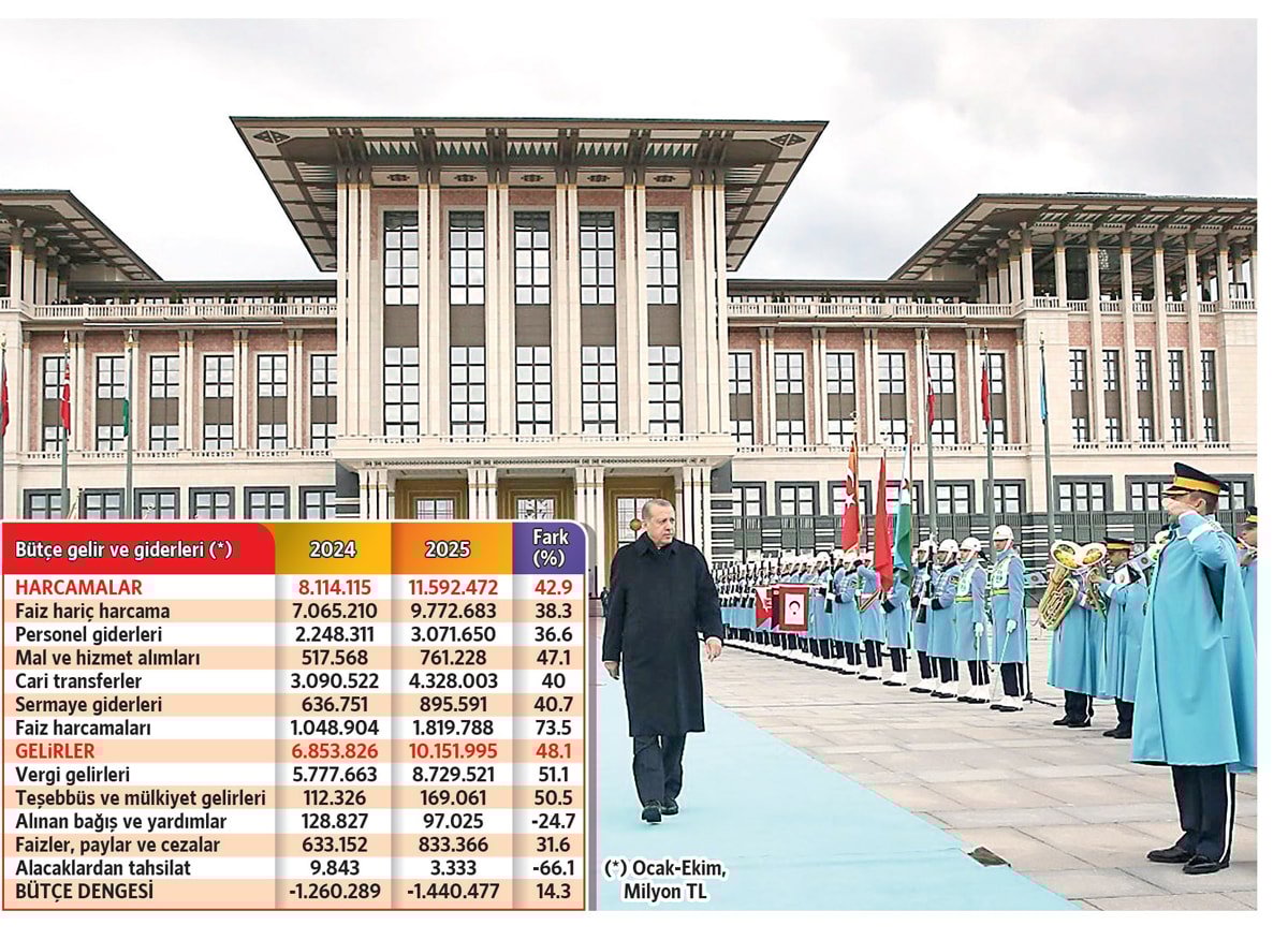Yılın ocak-ekim aylarını kapsayan 10 aylık dönemde iktidar 10 trilyon 152 milyar lira gelir toplamasına rağmen harcamaları 11 trilyon 592 milyar lirayı aşınca bütçe açığı 1 trilyon 440 milyar liralık devasa boyuta ulaştı. 10 ayda bütçe giderleri yüzde 42.9, personel giderleri yüzde 36.6 artarken faiz giderlerindeki artış yüzde 73.5’le zirveye çıktı.