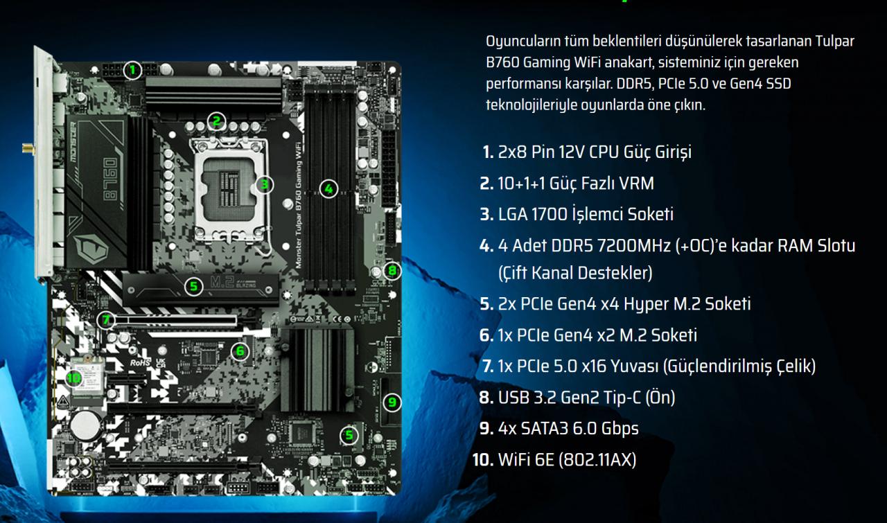 DDR5, PCIe 5.0 ve WiFi 6E gibi güncel teknolojileri merkezine alan sistem, üst seviye oyun deneyimini ulaşılabilir kılmayı hedefliyor.